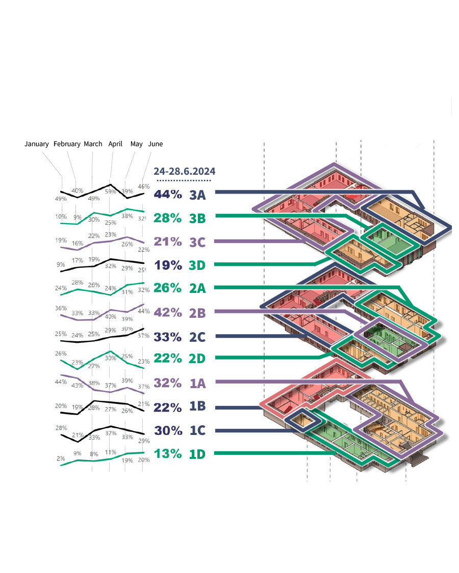 The number of persons in the area is calculated by subtracting the total number of persons leaving the area from the total number of persons entering the area. The utilisation rate is calculated as a percentage of the maximum capacity defined for the area. The utilisation rate takes into account the defined periods of days and times of day during which the number of persons in the premises is averaged, e.g. "weekdays 08:00 to 16:00". For the selected period, first the average of each hour is calculated and then the average of the hours over the period. We ensure the 24/7 automated counting.